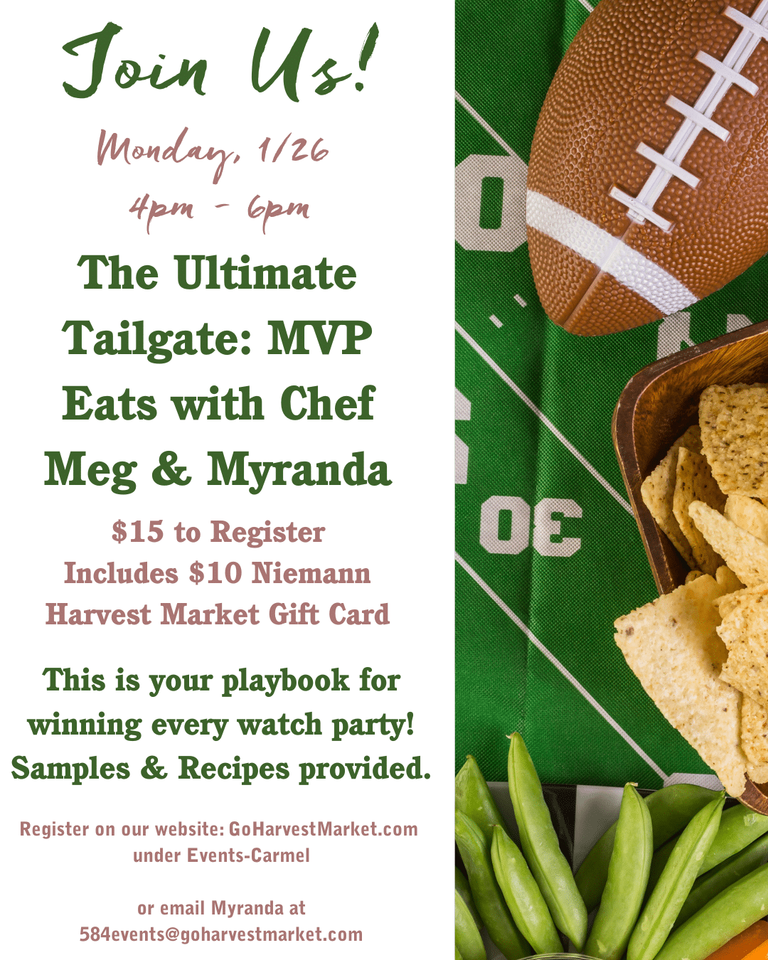 Jan 26 4:00 pm - 6:00 pm The Ultimate Tailgate: MVP Eats with Chef Meg & Myranda Carmel Niemann Harvest Market 2140 E 116th Street, Carmel Event Details Get Directions
