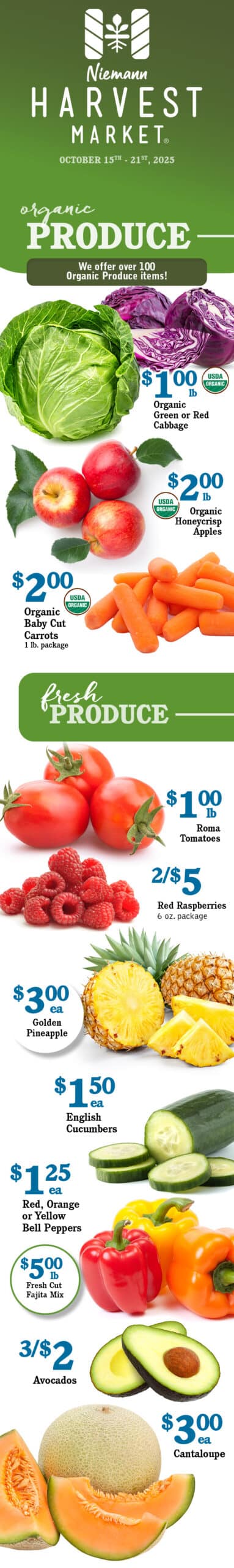 Fresh Savings This Week at Your Niemann Harvest Market in Carmel, Indiana Hours & Location Sign Up For Weekly Specials Emails Price valid October 15, 2025 - October 21, 2025Click the images below to enlarge