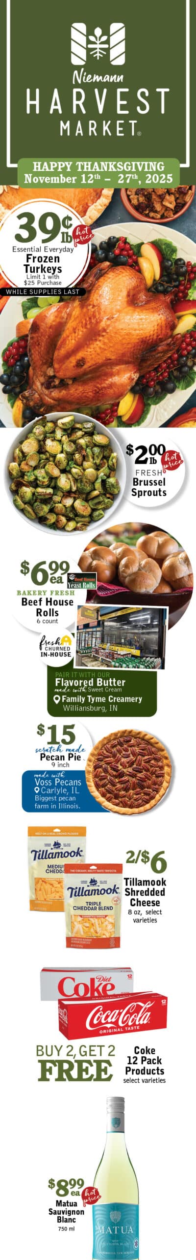 Fresh Savings This Week at Your Niemann Harvest Market in Carmel, Indiana Hours & Location Sign Up For Weekly Specials Emails Price valid November 12, 2025 - November 27, 2025Click the images below to enlarge